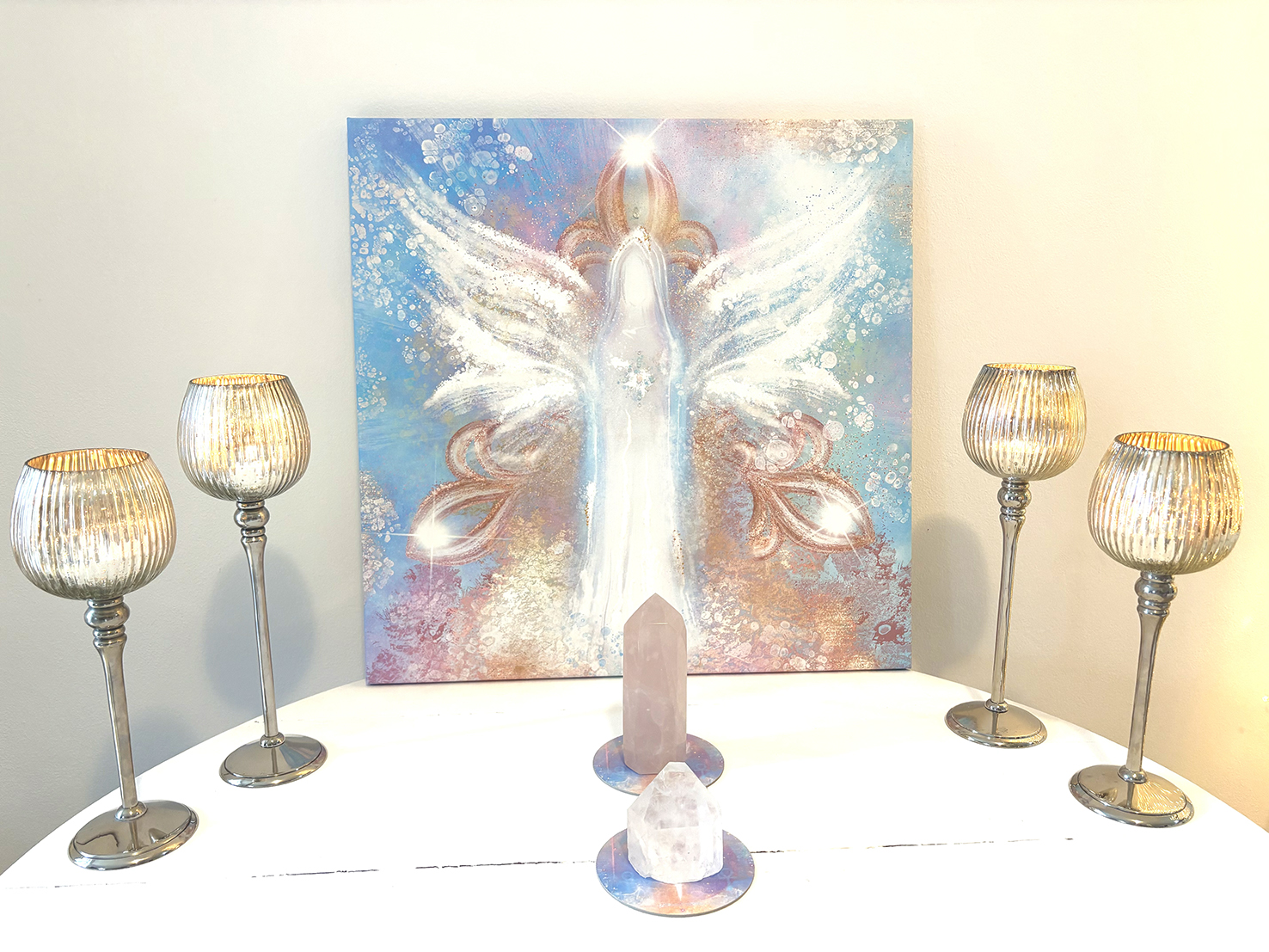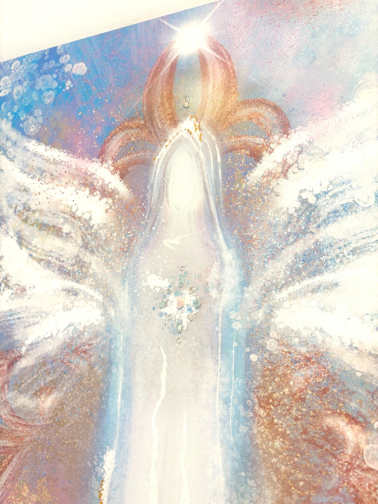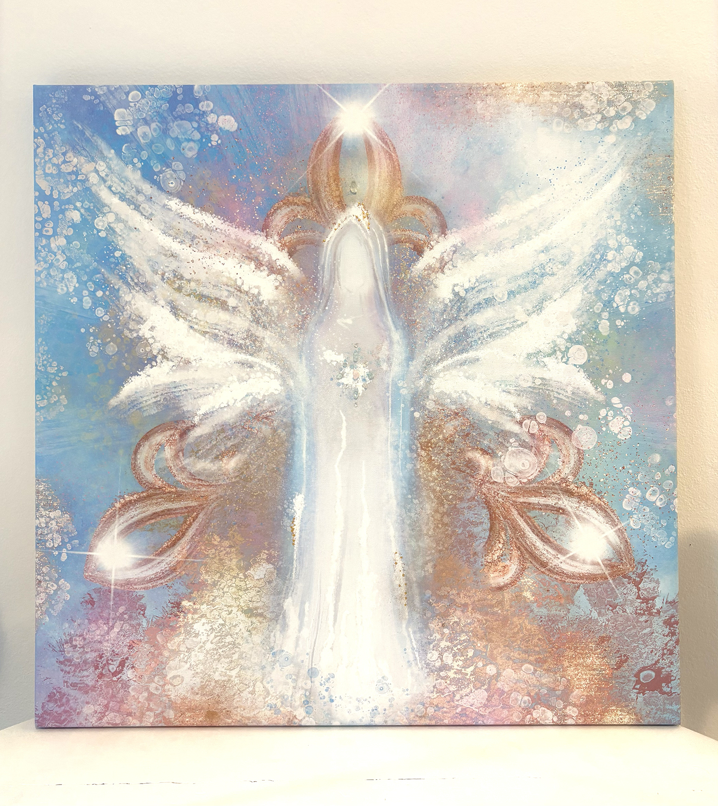 Obraz Anděla na plátně na blind rámu 60x60 cm, připravený k odeslání. Vytvořený kombinací digitální malby a akrylu, zdobený krystaly a zlatými pigmenty.