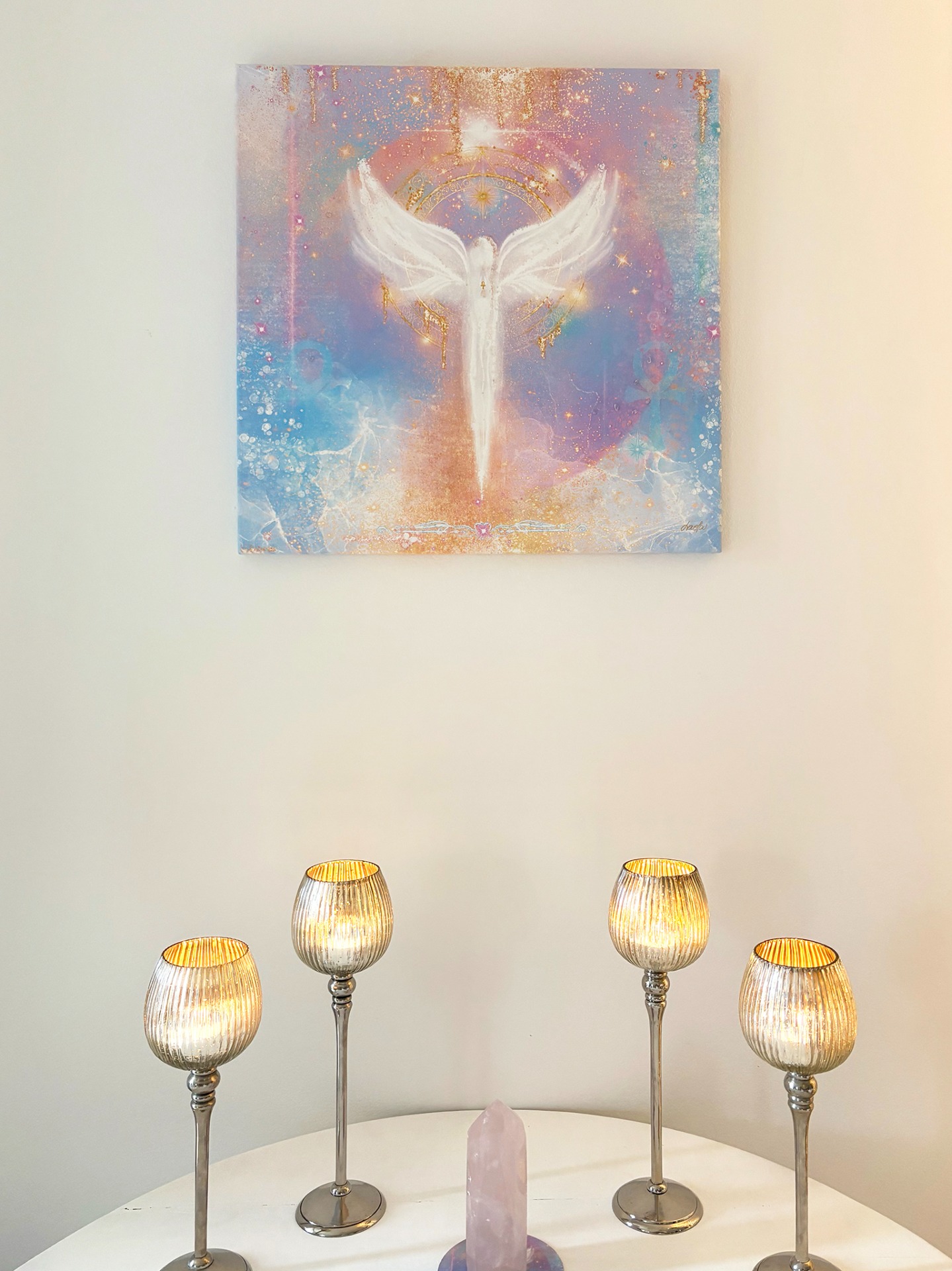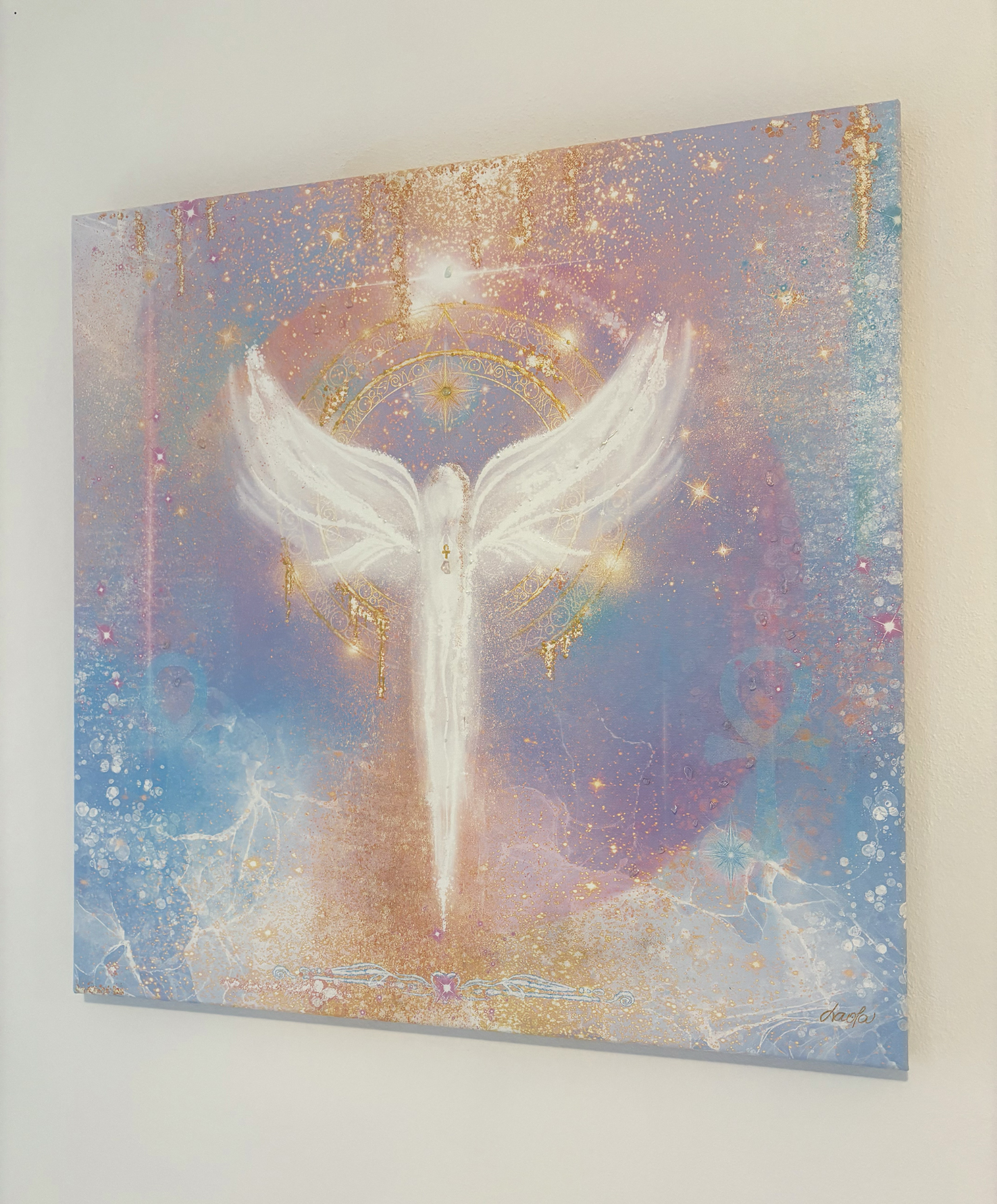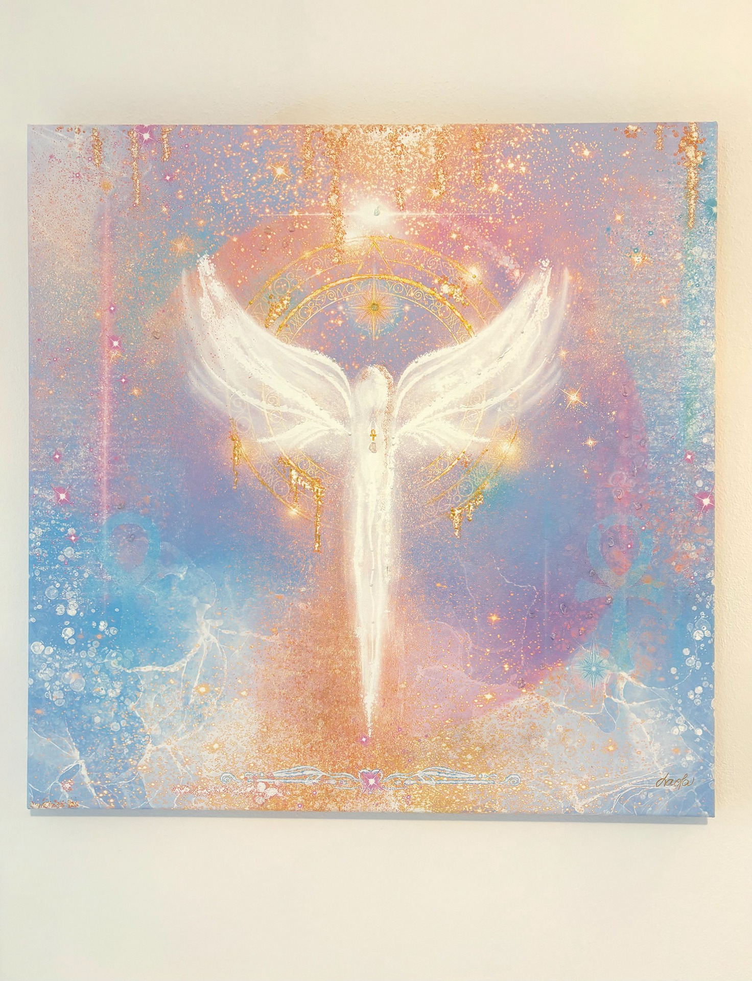 Obraz Anděla na plátně na blind rámu 60x60 cm, připravený k odeslání. Vytvořený kombinací digitální malby a akrylu, zdobený krystaly a zlatými pigmenty.