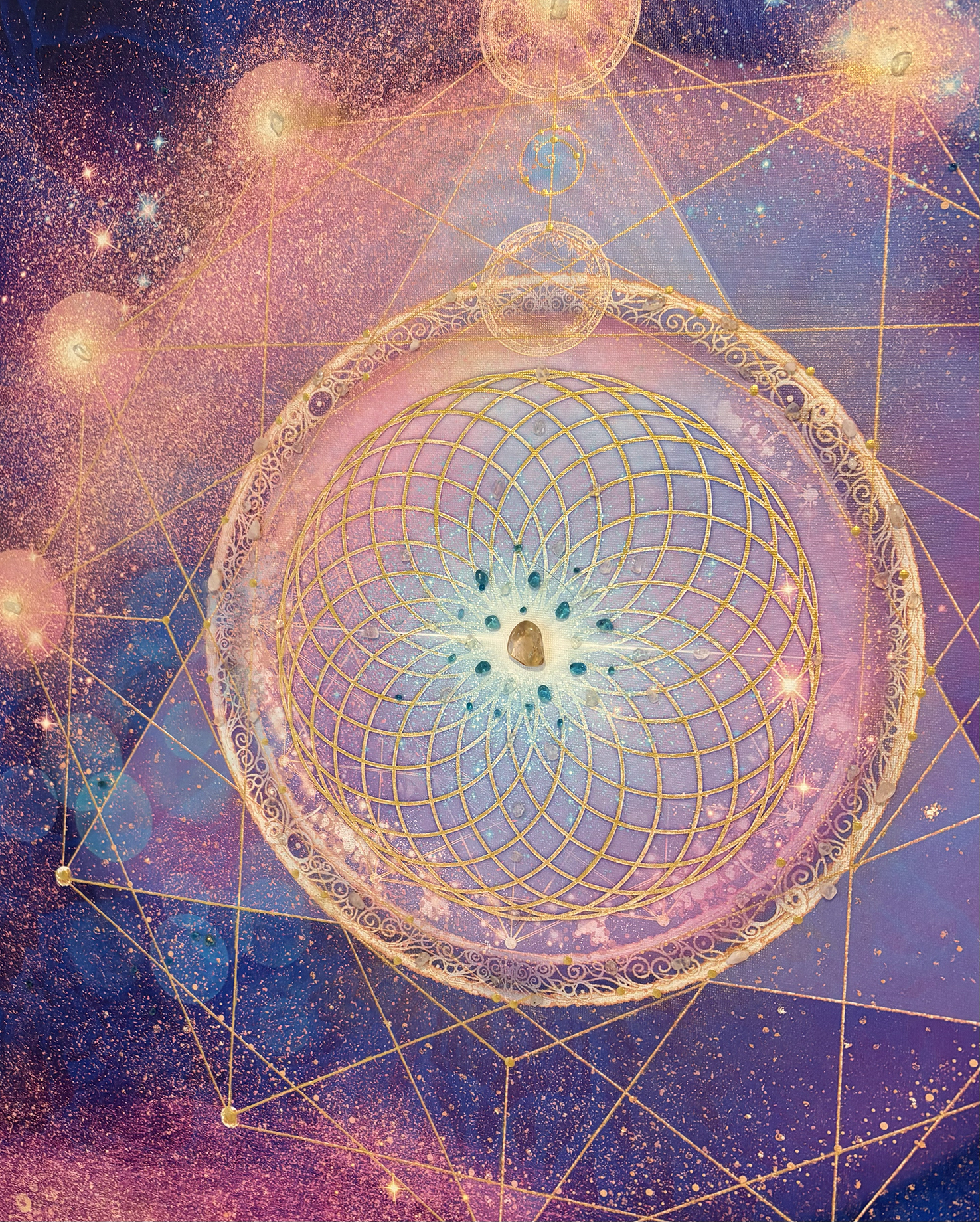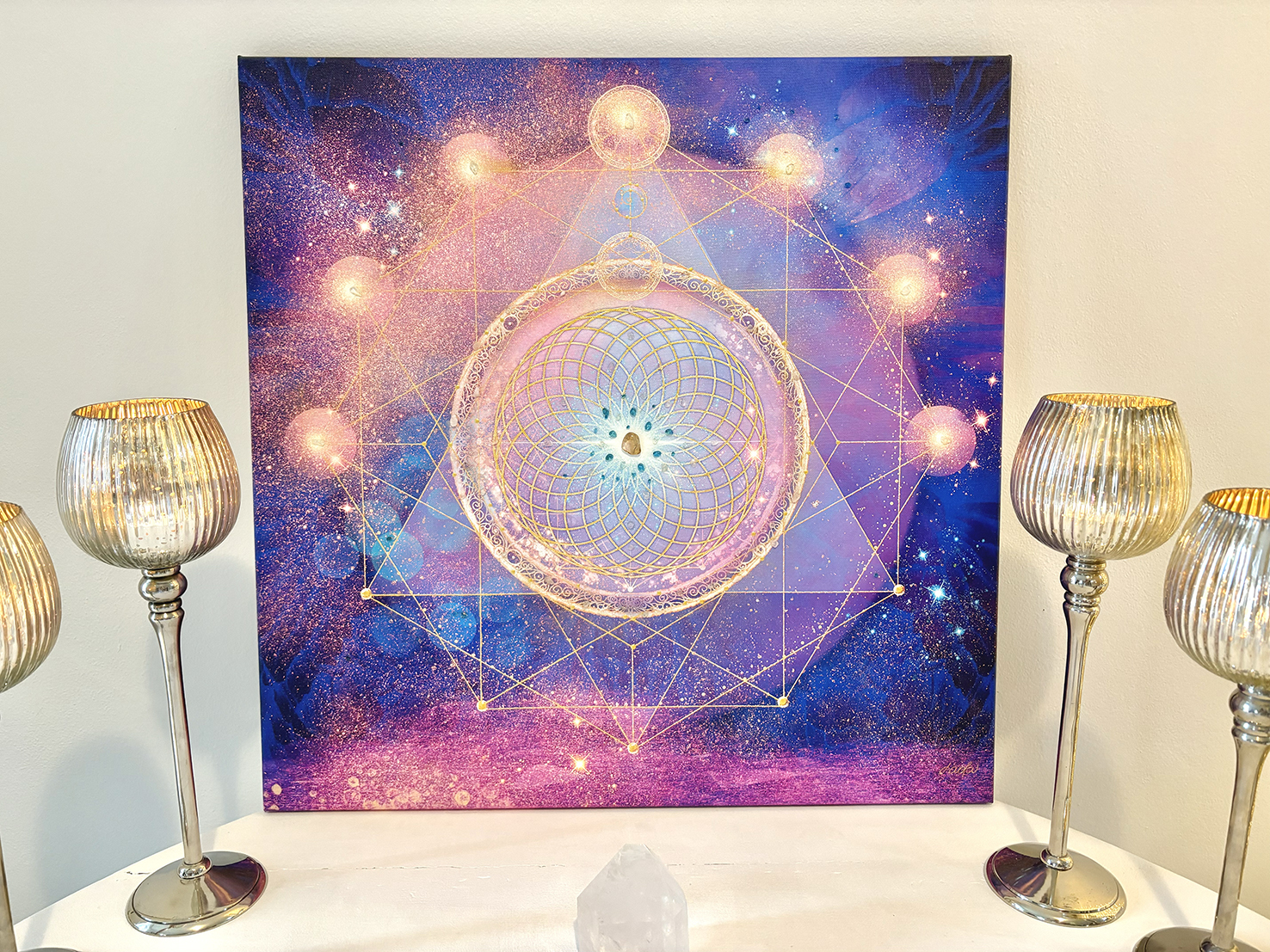 Obraz na plátně na blind rámu 60x60 cm, připravený k odeslání. Vytvořený kombinací digitální malby a akrylu, zdobený krystaly a zlatými pigmenty.