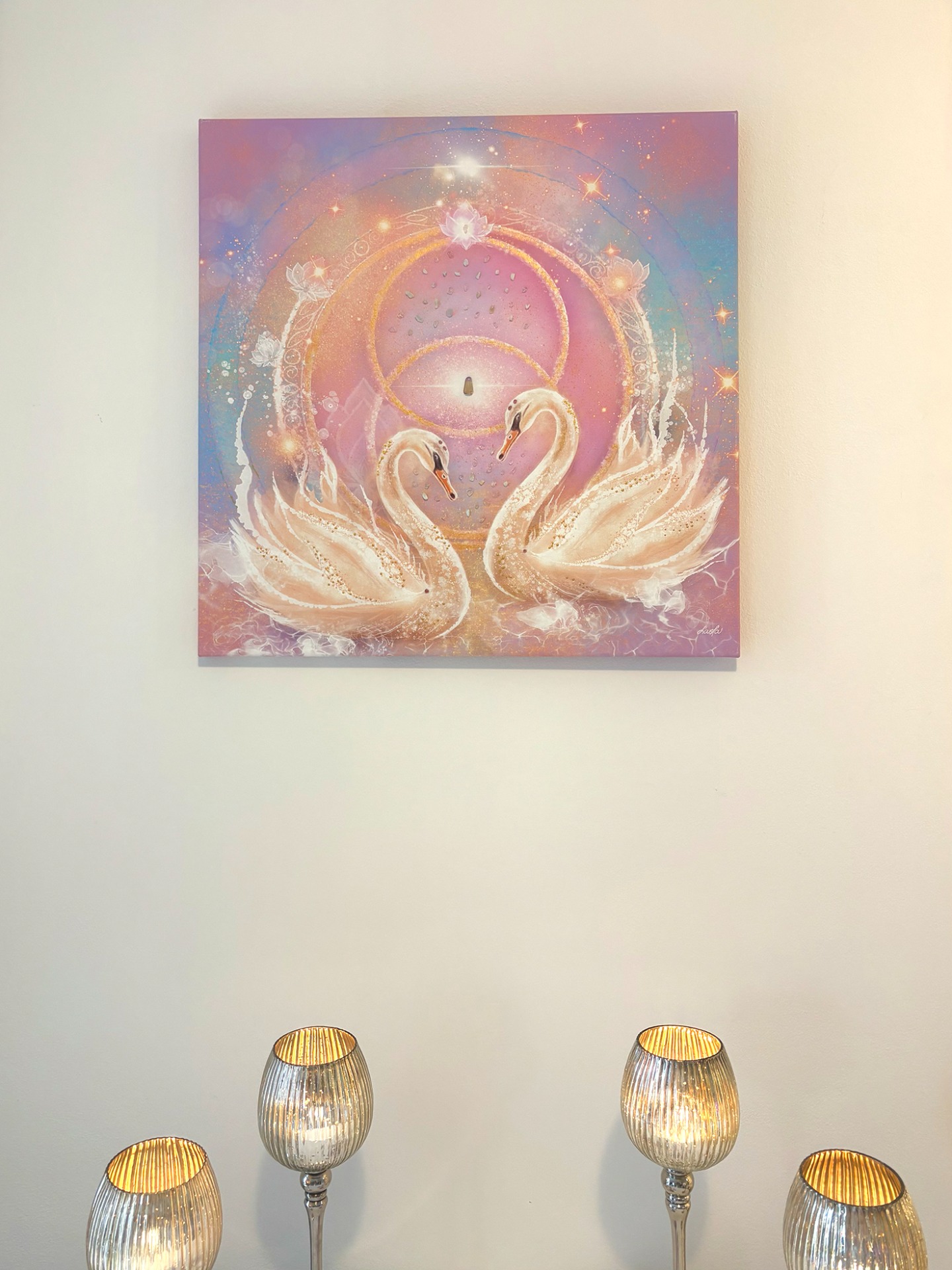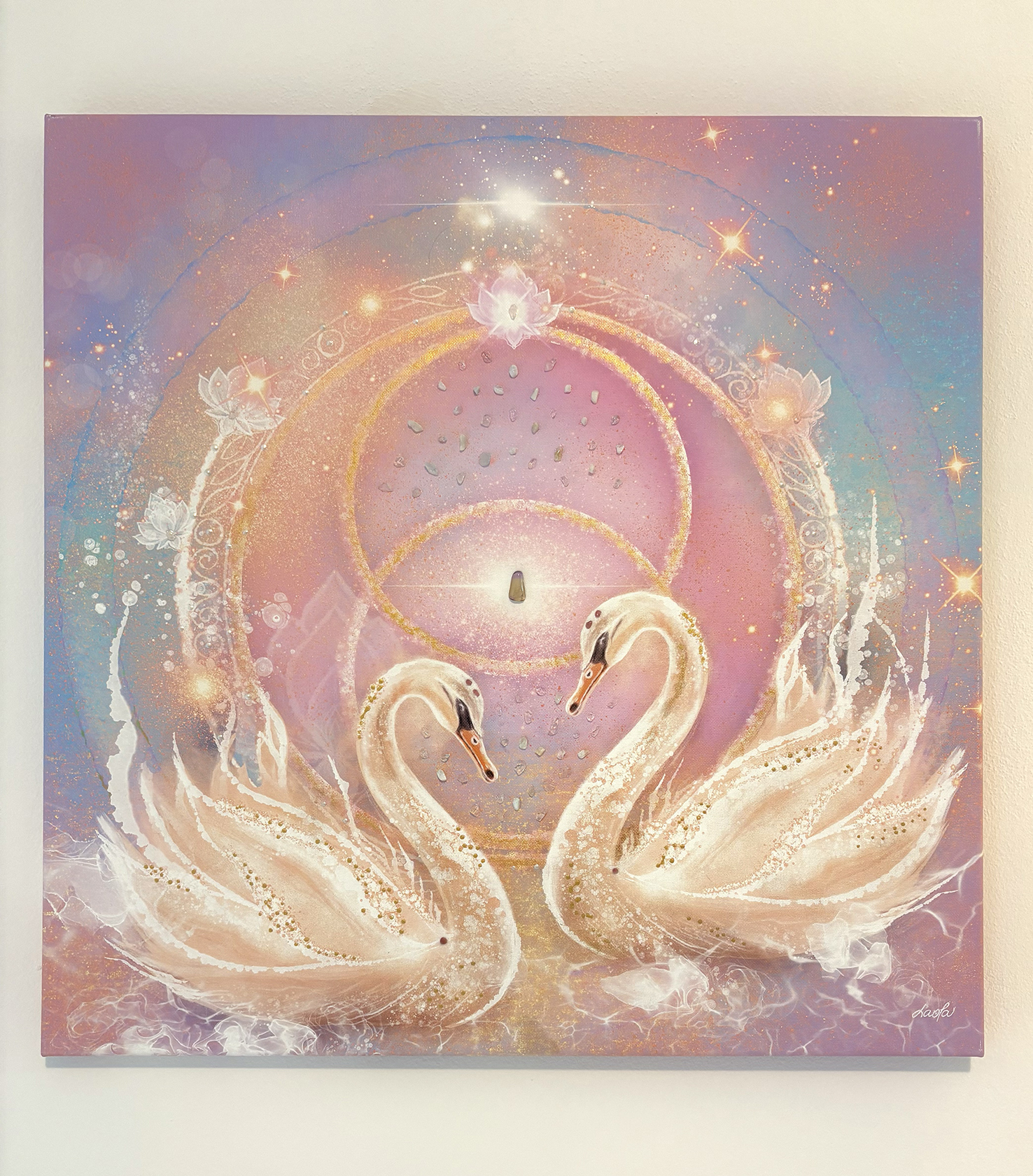 Obraz na plátně na blind rámu 60x60 cm, připravený k odeslání. Vytvořený kombinací digitální malby a akrylu, zdobený krystaly a zlatými pigmenty.